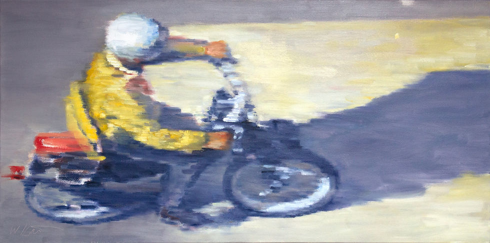 Somewhere on a bridge or a hotel balcony, you'll find Warren Keating capturing video of unsuspecting figures walking below. Later, in a studio in Santa Fe, you can find him pouring through frame after frame of the video footage to find the perfect moment of weight shift, swing of the arm or tilt of the head, which he feverishly paints, covering large canvases with thick paint depicting an overhead view of a walking figure in an urban setting. His work invites you to celebrate the moment using the perspective of a camera with the subtlety of light and color that can only be captured with oil on canvas. His signature “Pixel Impressionism” brush strokes create the motion and details of the walking figure and communicate Keating’s passion for the subject.
